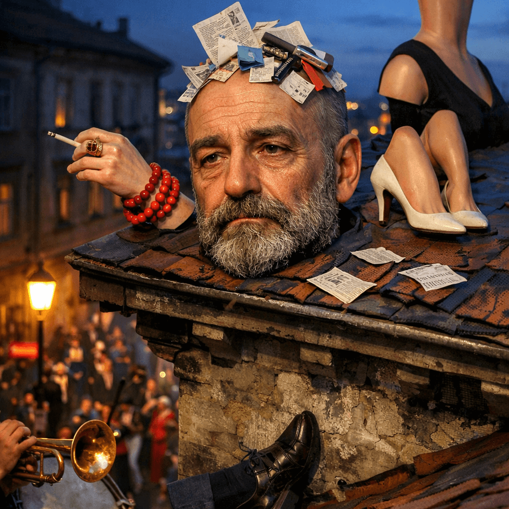 Una testa abbandonata sul tetto di una casa osserva, silenziosa, il teatro del mondo.Questa poesia, sospesa…